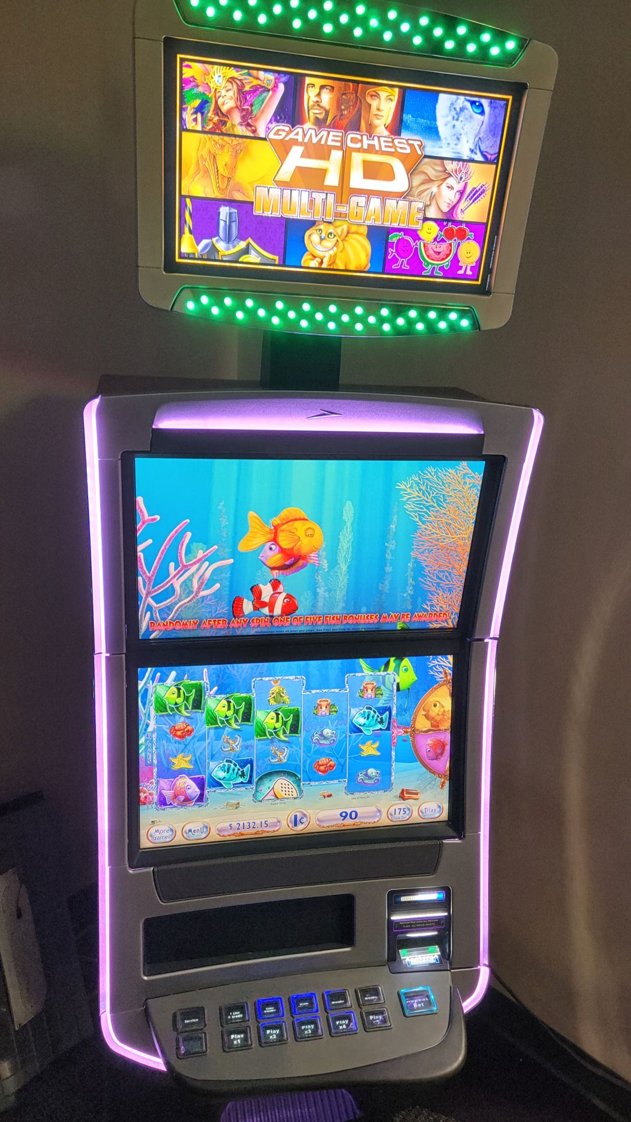 Welcome to the awesome world of the PLATINUM Aruze Gen-X game. With it’s (optional) tall Platinum Bar topper making this game 9 feet all, RGB Surrounding LED’s, and its AMAZING LED light shows with RGB Back-Lit reels, this game really puts on a show! WAY ahead of it’s time for the era of this game, it’s incredibly fun to play. It talks to you (yes it uses WORDS not just sounds and dings), has bonus Platinum Bars, and does an amazing video and light show when you hit the bonus.