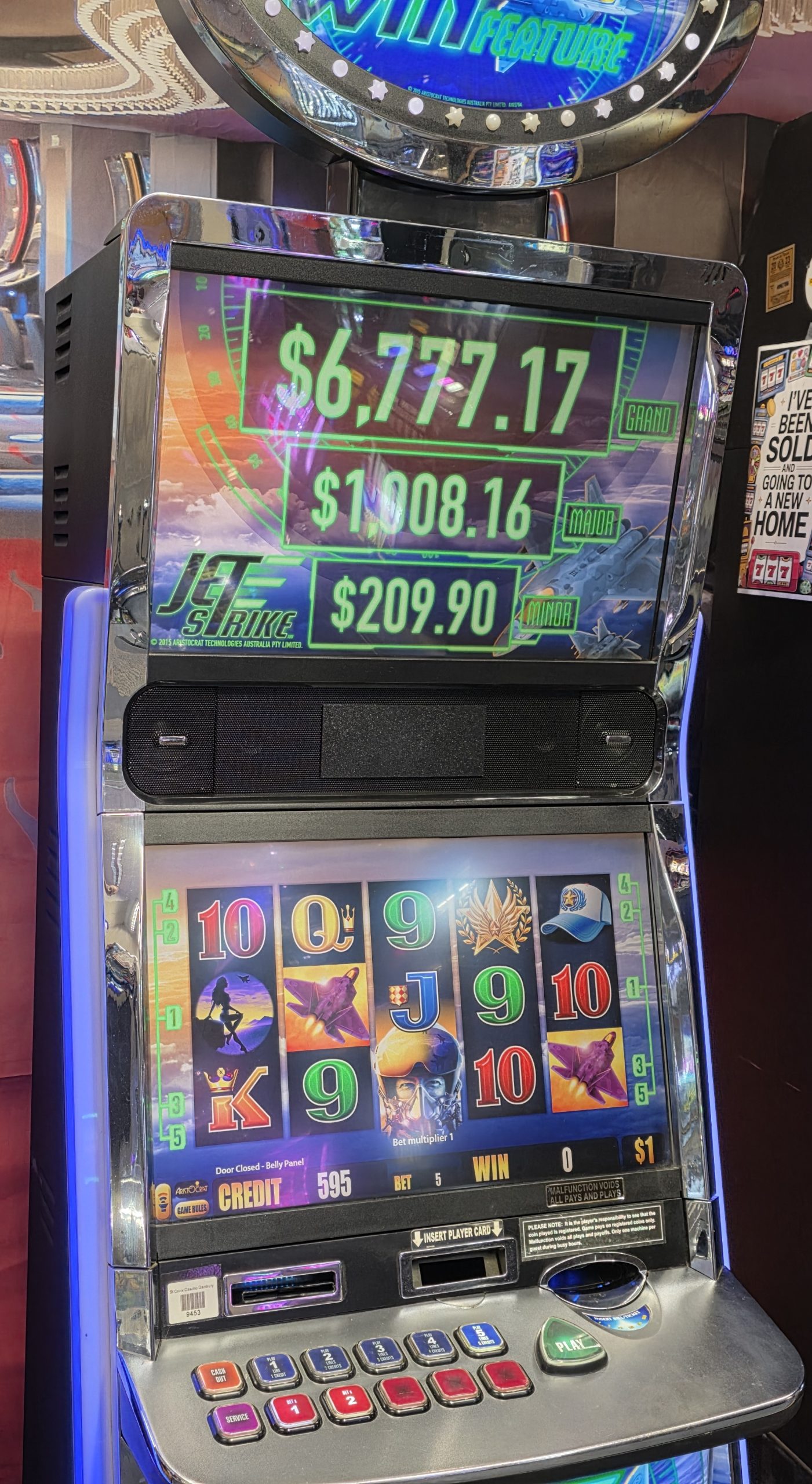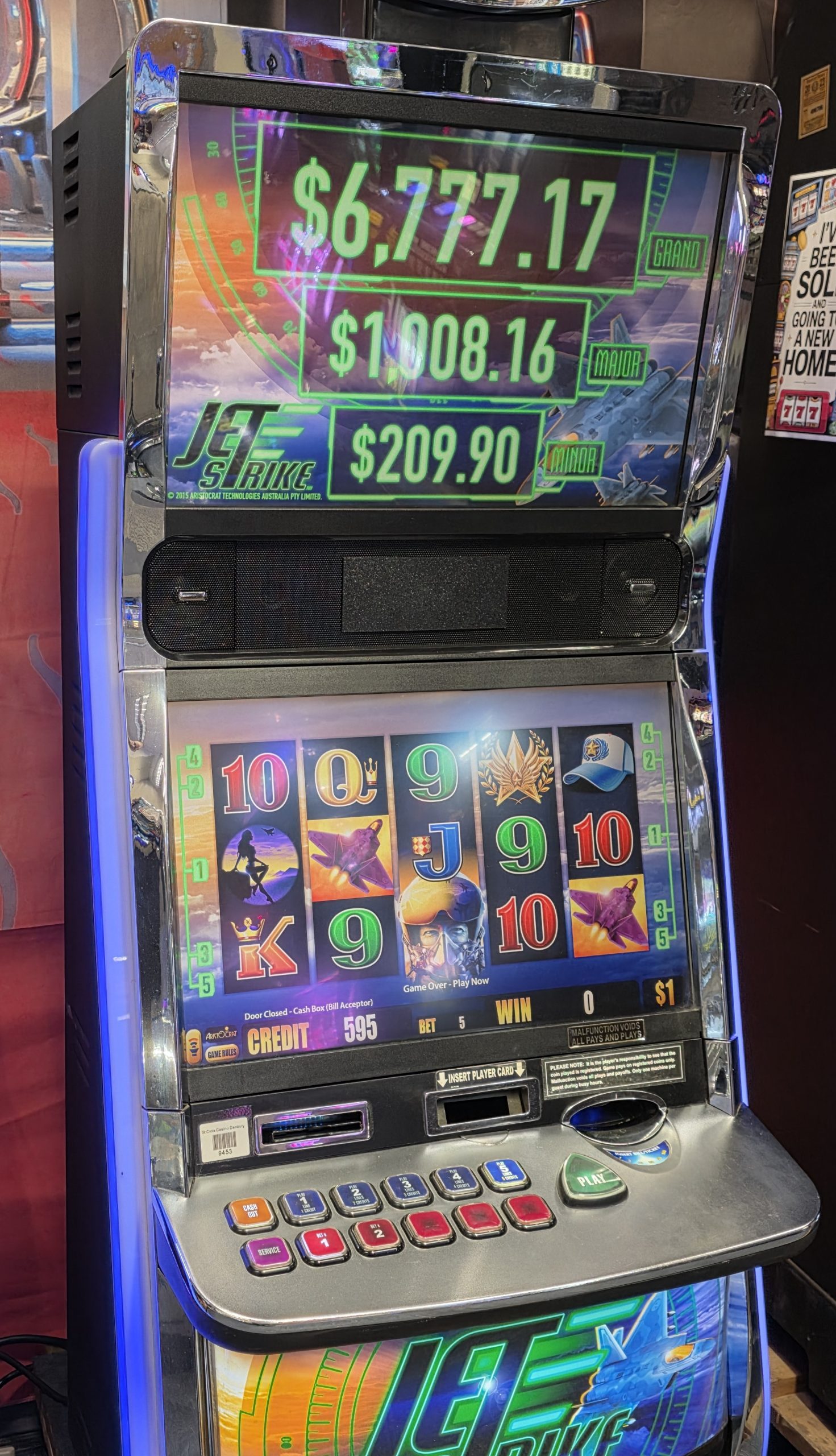 With the pioneering MK7 platform, Aristocrat created a number of VERY popular and sought after games, including this one, Jet Strike. Bring casino‑style fun home with this game! Providing hours of fun, this authentic Aristocrat Jet Strike in the Viridian Widescreen cabinet will sure to be an eye catcher at any home arcade, game room, she-shed or mancave.