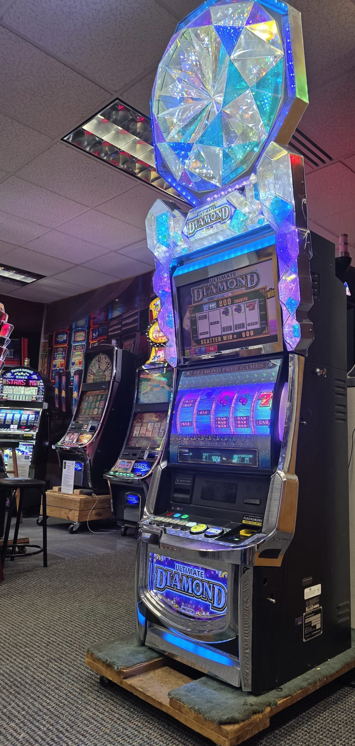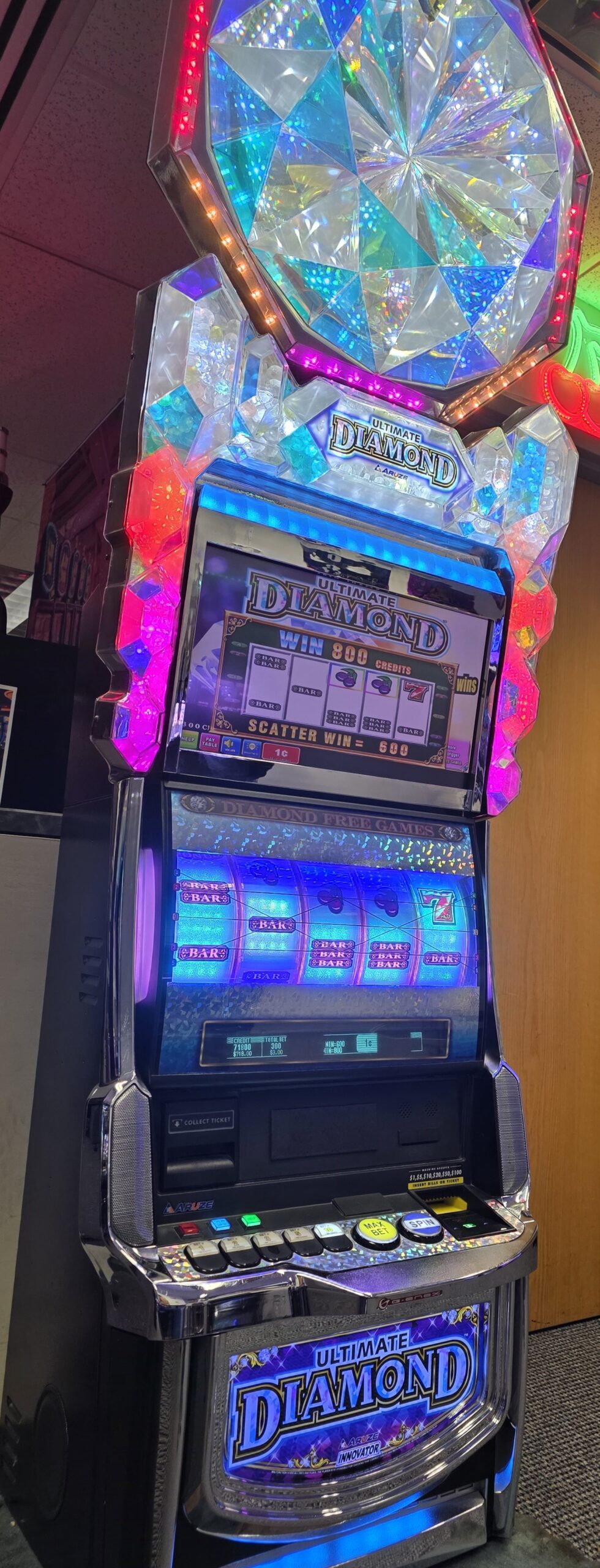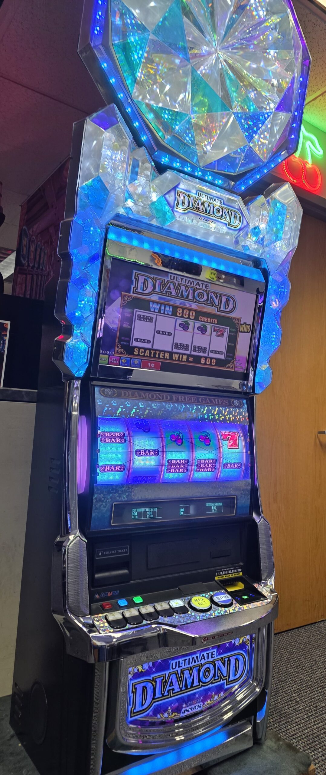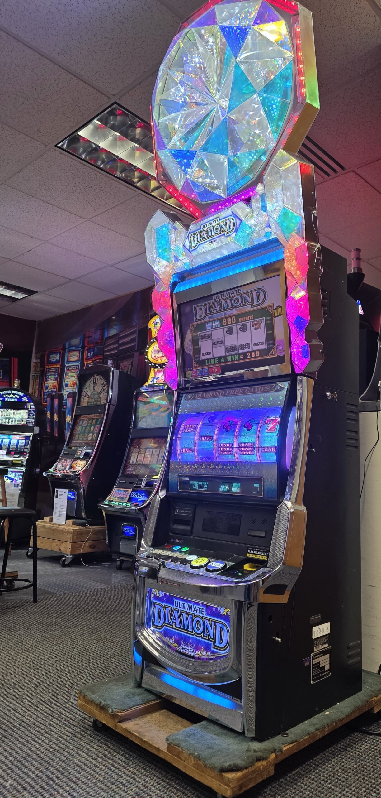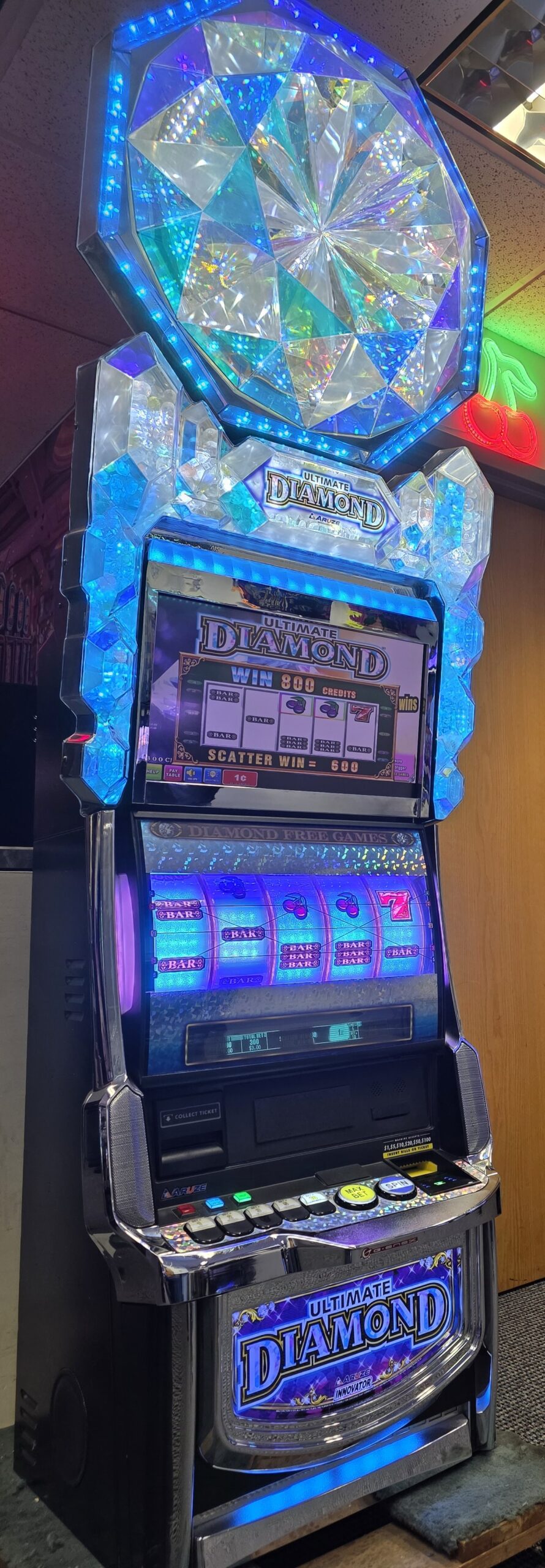 Welcome to the awesome world of the DIAMOND Aruze Gen-X game. The colors and lights will draw you in, the game play will keep your attention! With it’s (optional) Super-Tall Diamond top, and amazing Light show, this game is a real show-stopper. At just under 10′ tall, this game requires a high ceiling to keep the topper on this game. However, it’s very removable and we even added thumb-screws to make it easier to add/remove. The game works and plays and is still beautiful with or without the big topper.