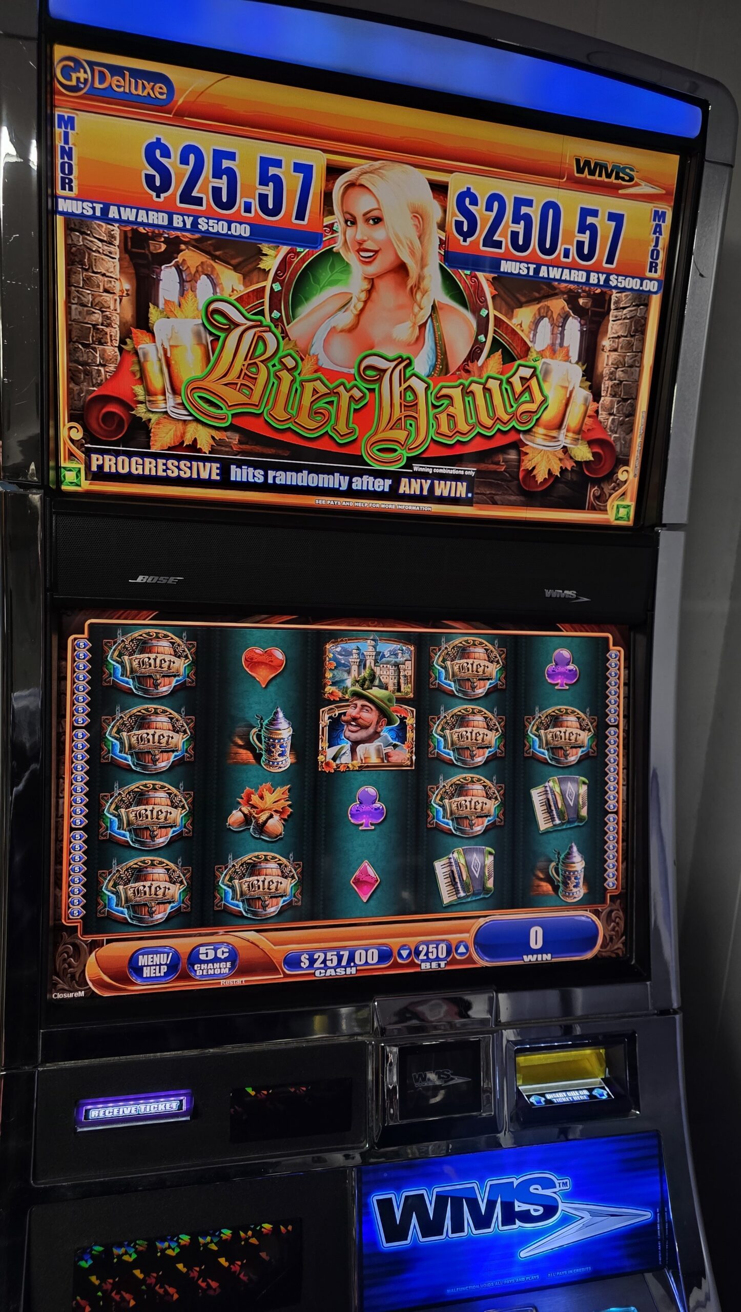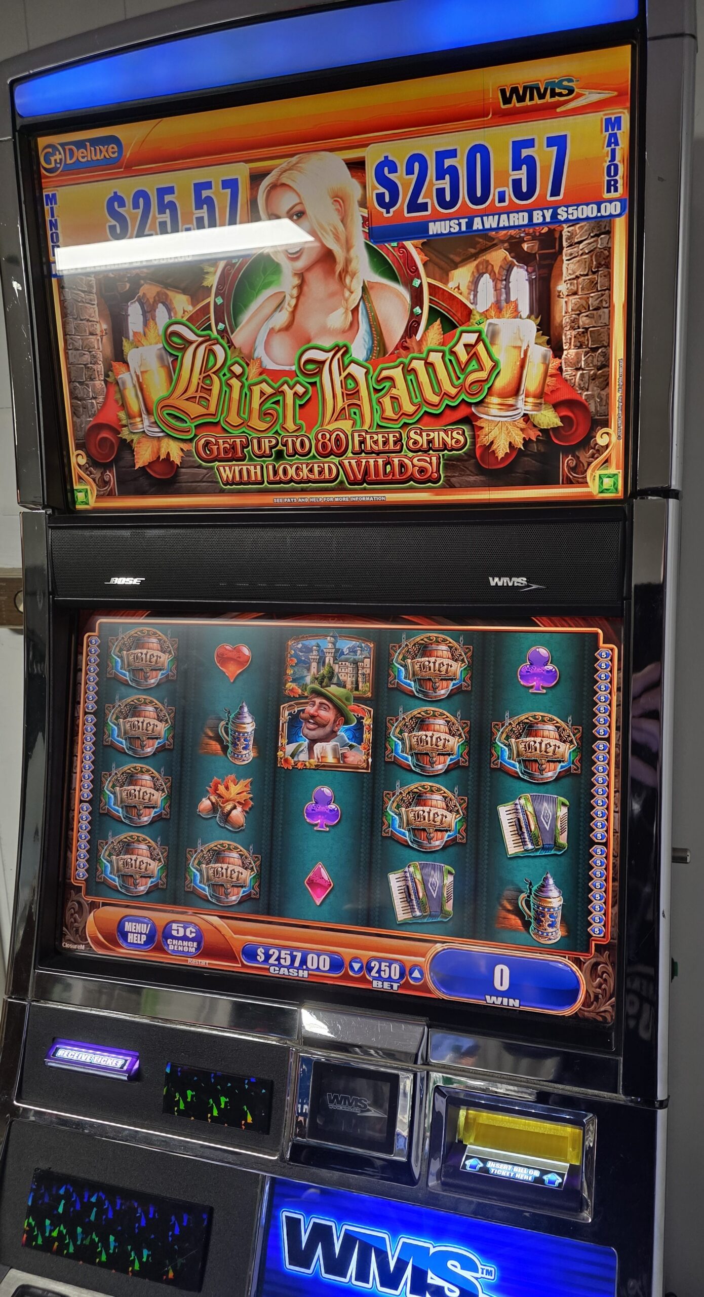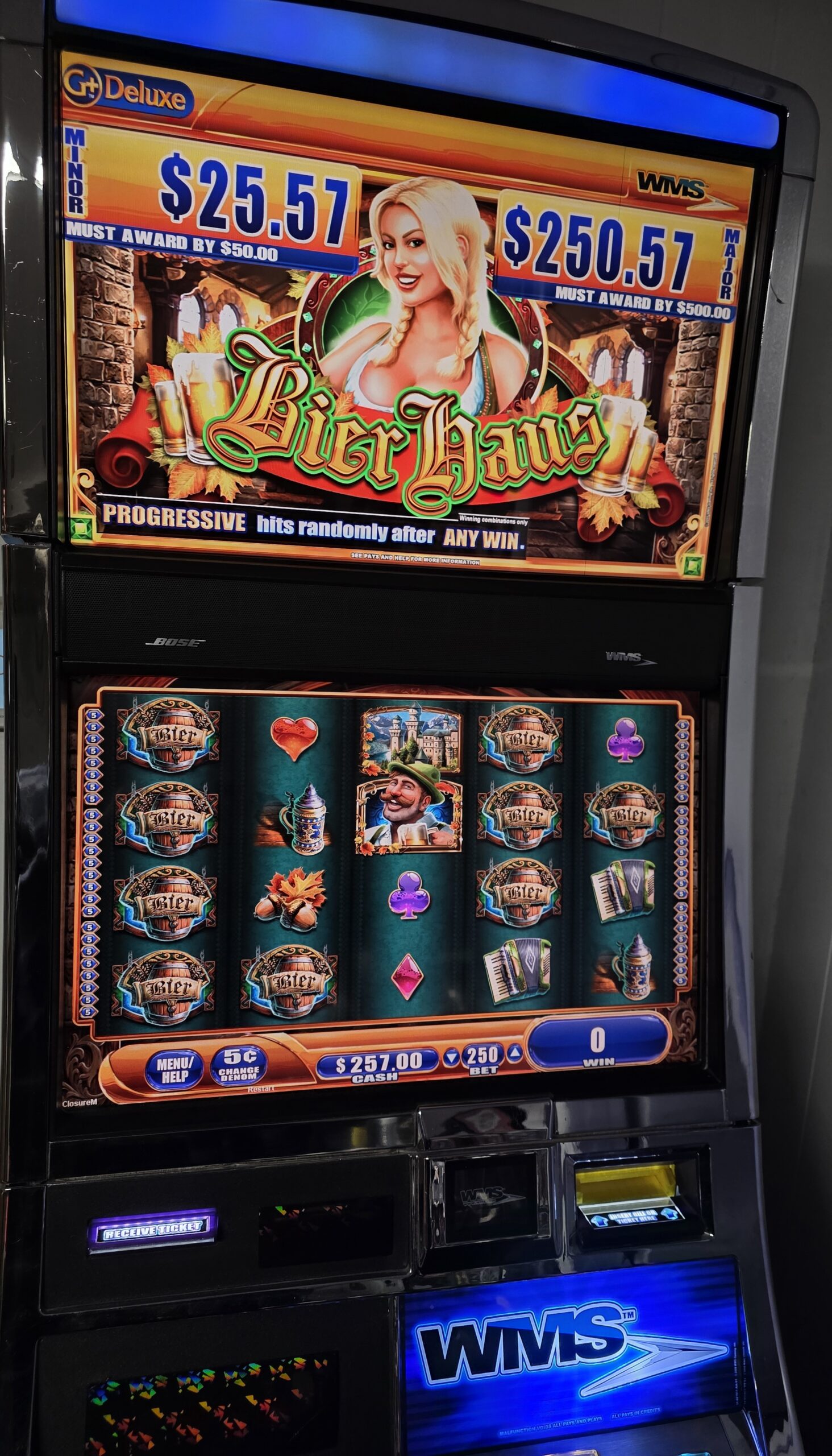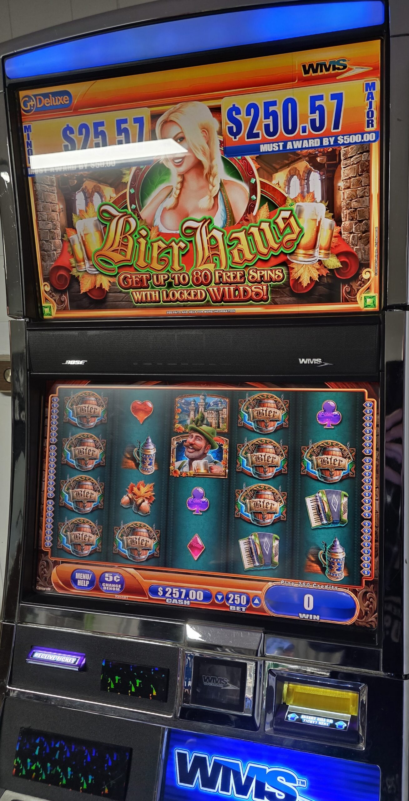 This machine features a touch display for the button deck with a large round lit physical button for “repeat bets” so the touch screen doesn’t take all of the use/abuse.