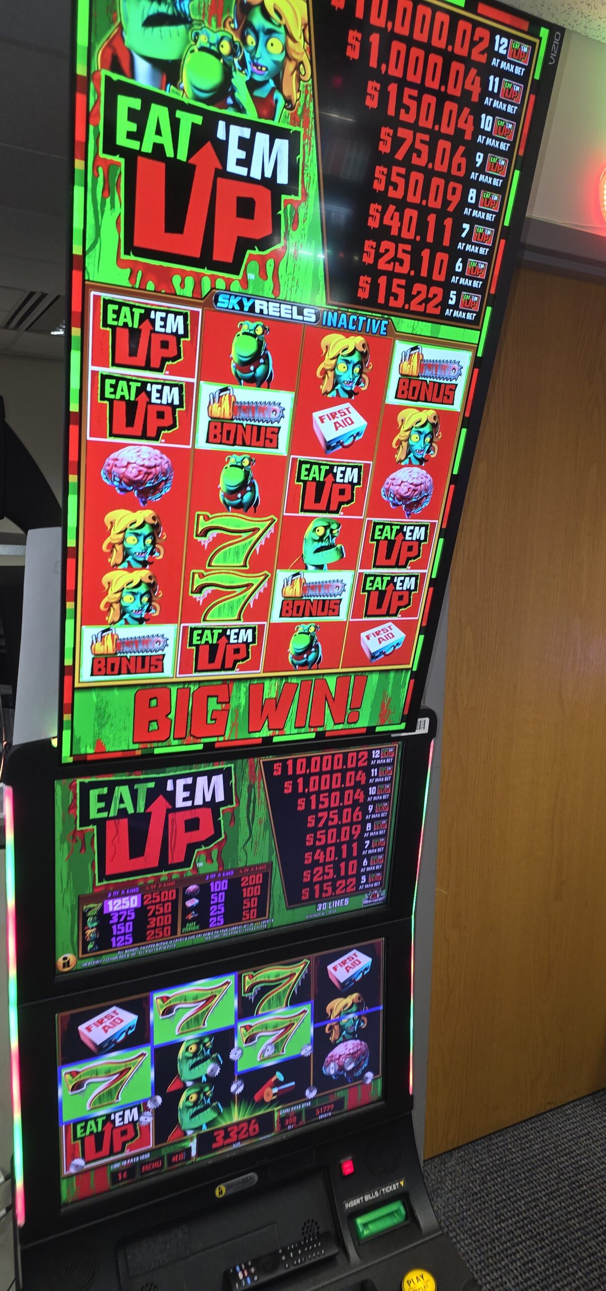 This machine accepts all US bills. Should you opt for the Advanced TITO option, it can print off paper tickets of your winnings and allow you to re-insert those tickets to redeem them for credits again. With our “ADVANCED TITO” option, not only is there a free-play button but you can’ connect to the game via WIFI and even change what prints on the ticket!
