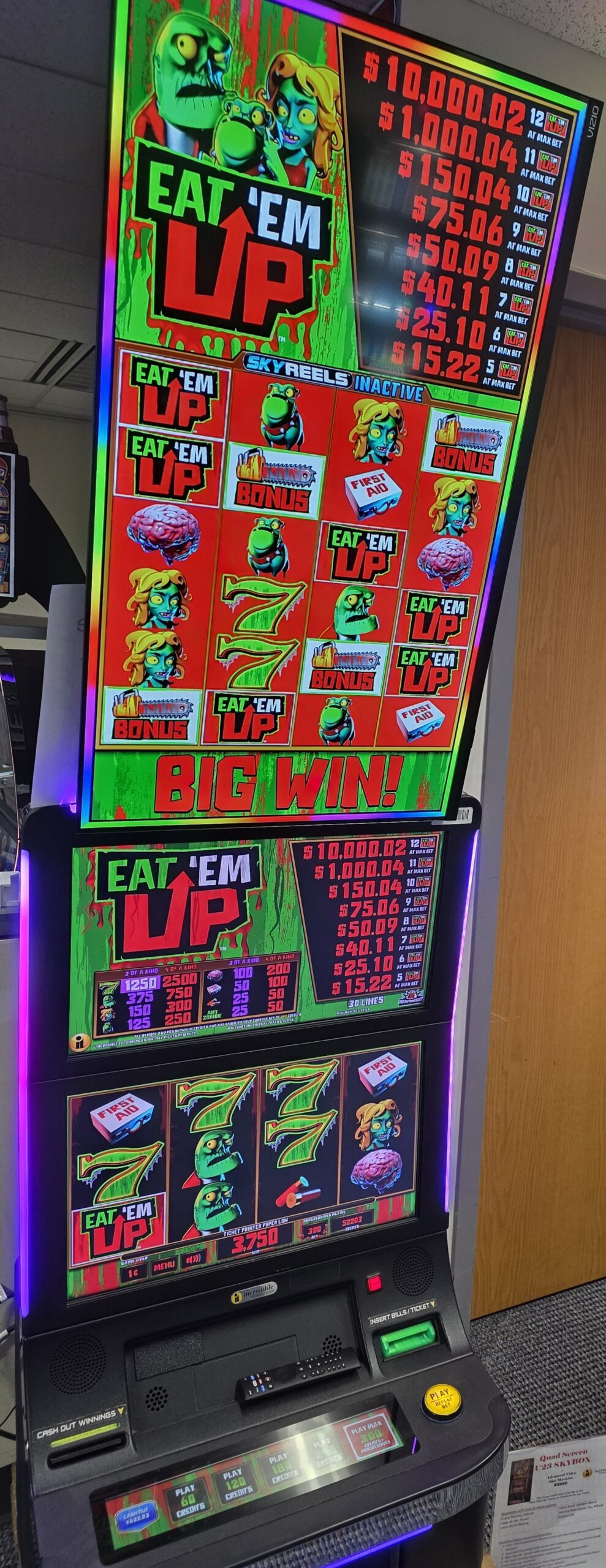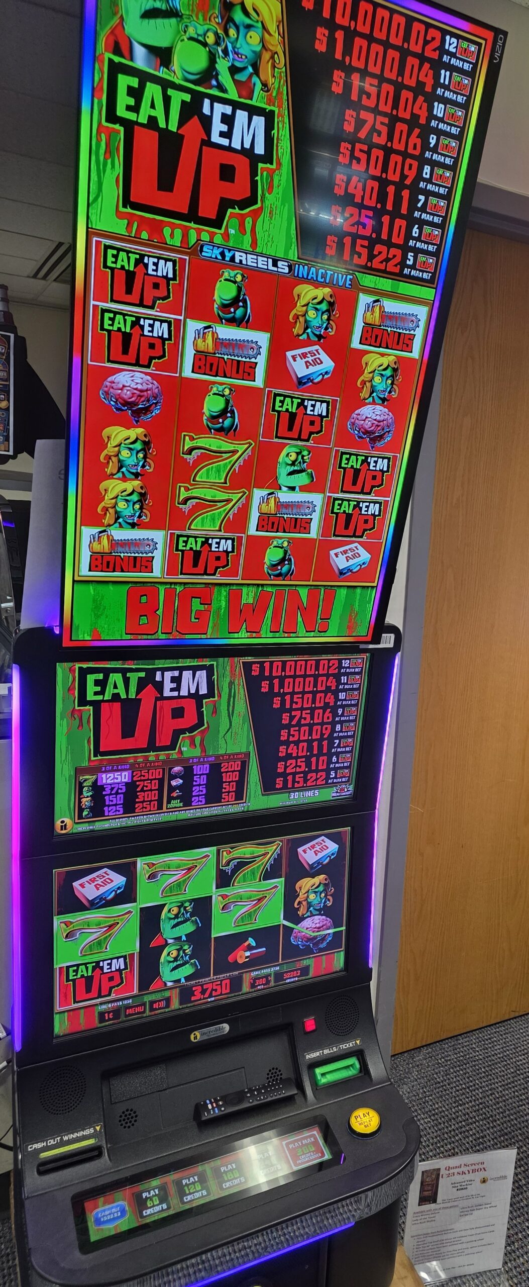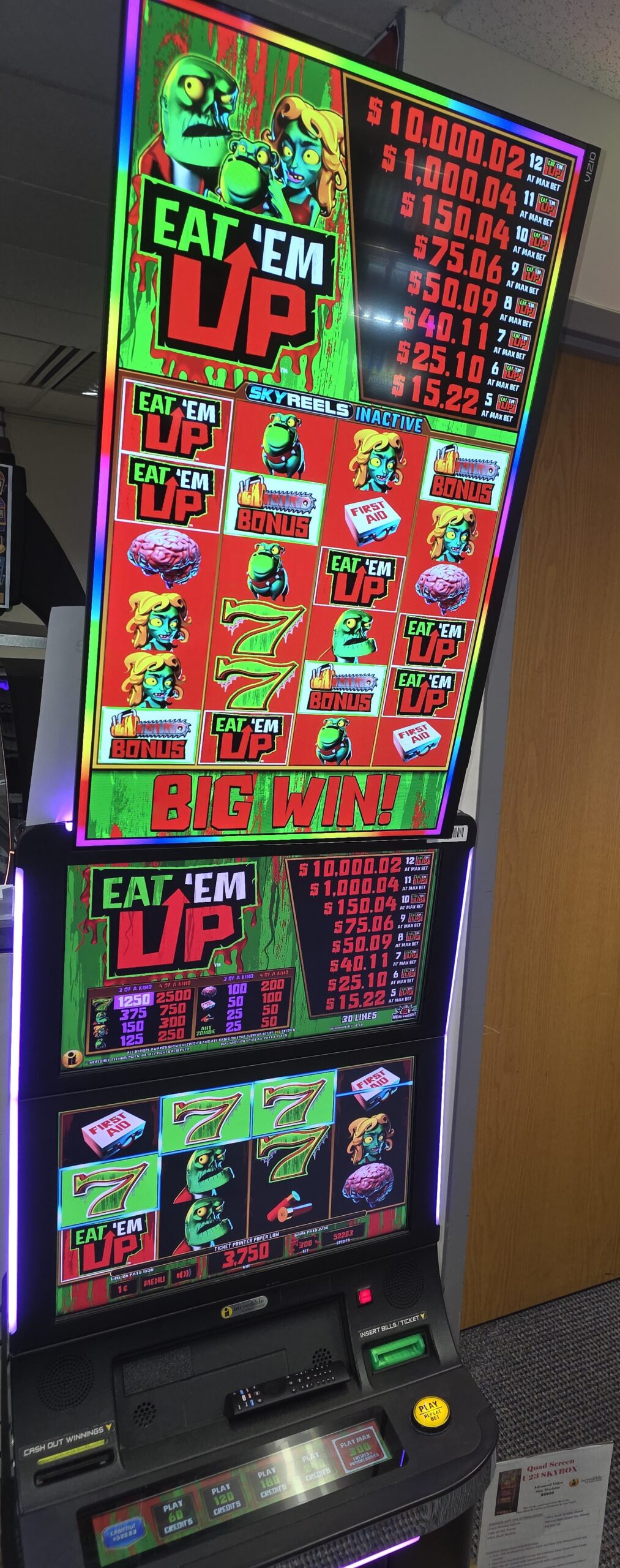 ~ Incredible Technologies ~ Eat’em Up Zombies ~ Quad Screen U23 SkyBox – $2950