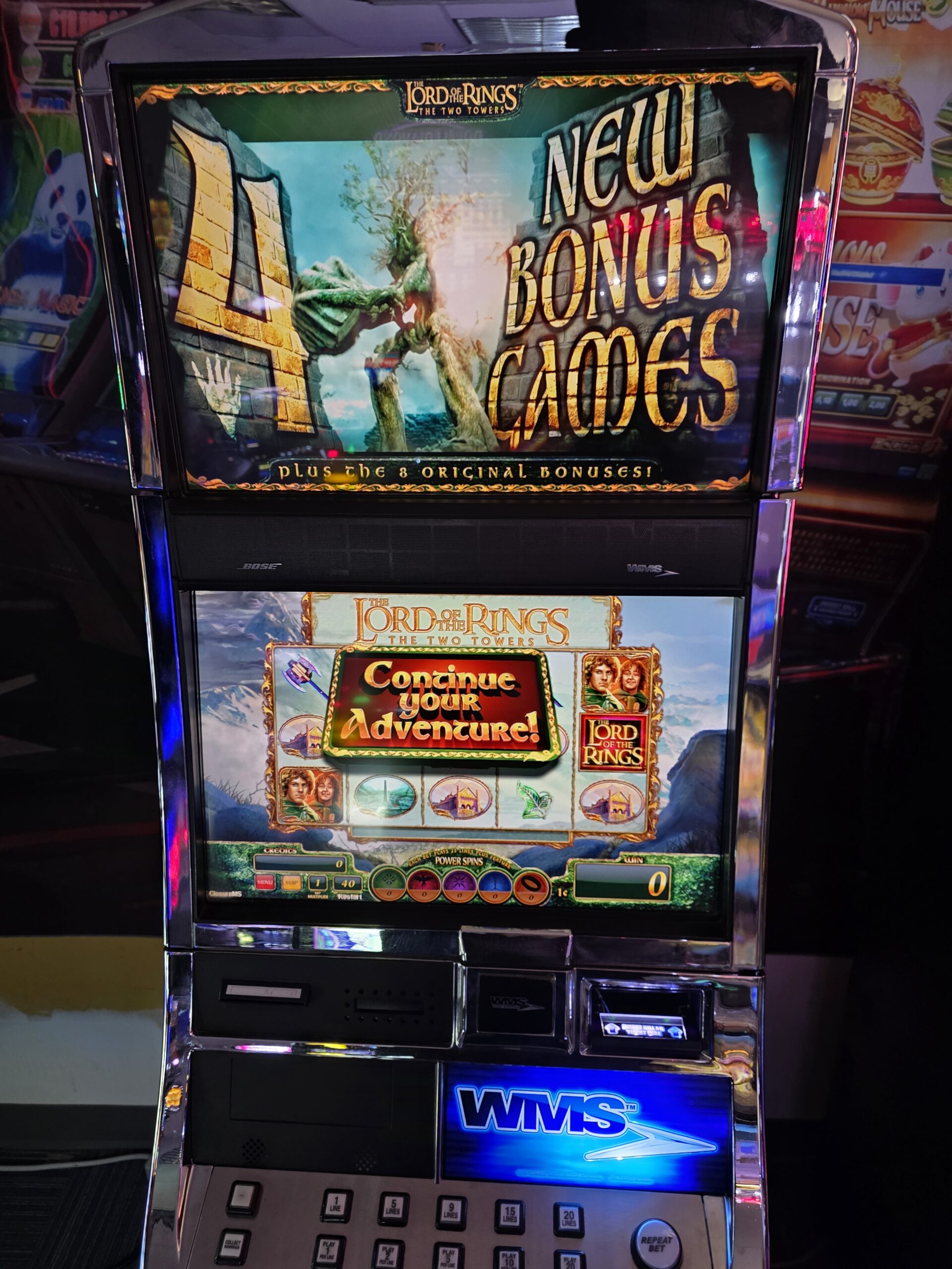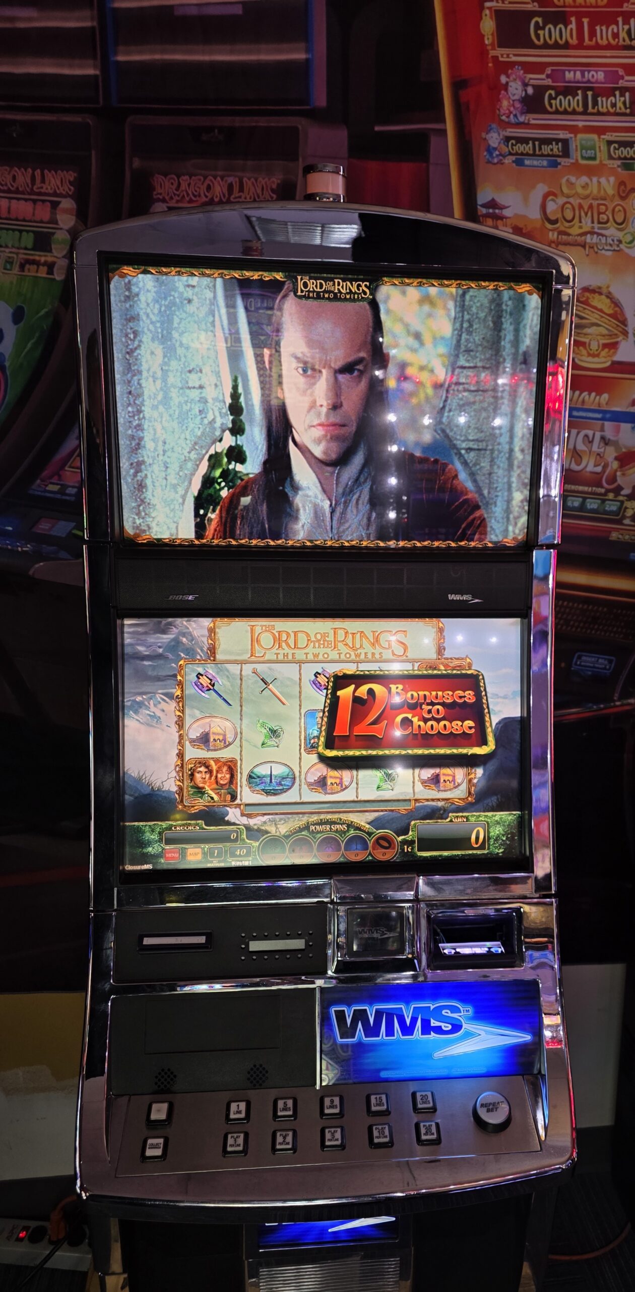 Welcome to the modern era of slot machines!!! This is the BB3 Blade by WMS Gaming running the Illinois Game Chest 1 with a focus on Elvis & Monopoly. This machine is still in use at Casinos here in St. Louis and around the country. The WMS Bluebird 3 Blade is the latest addition to our stock of newer slot machines. This machine has some of the latest technology by WMS on the casino floor. The Blade cabinet features dual 23” LCD monitors and a beautiful “halo effect” emotive lighting that will draw the player’s eye and just pull you into the game. The pretty Wood-Grained finish makes the cabinet look more like furniture than a slot machine!