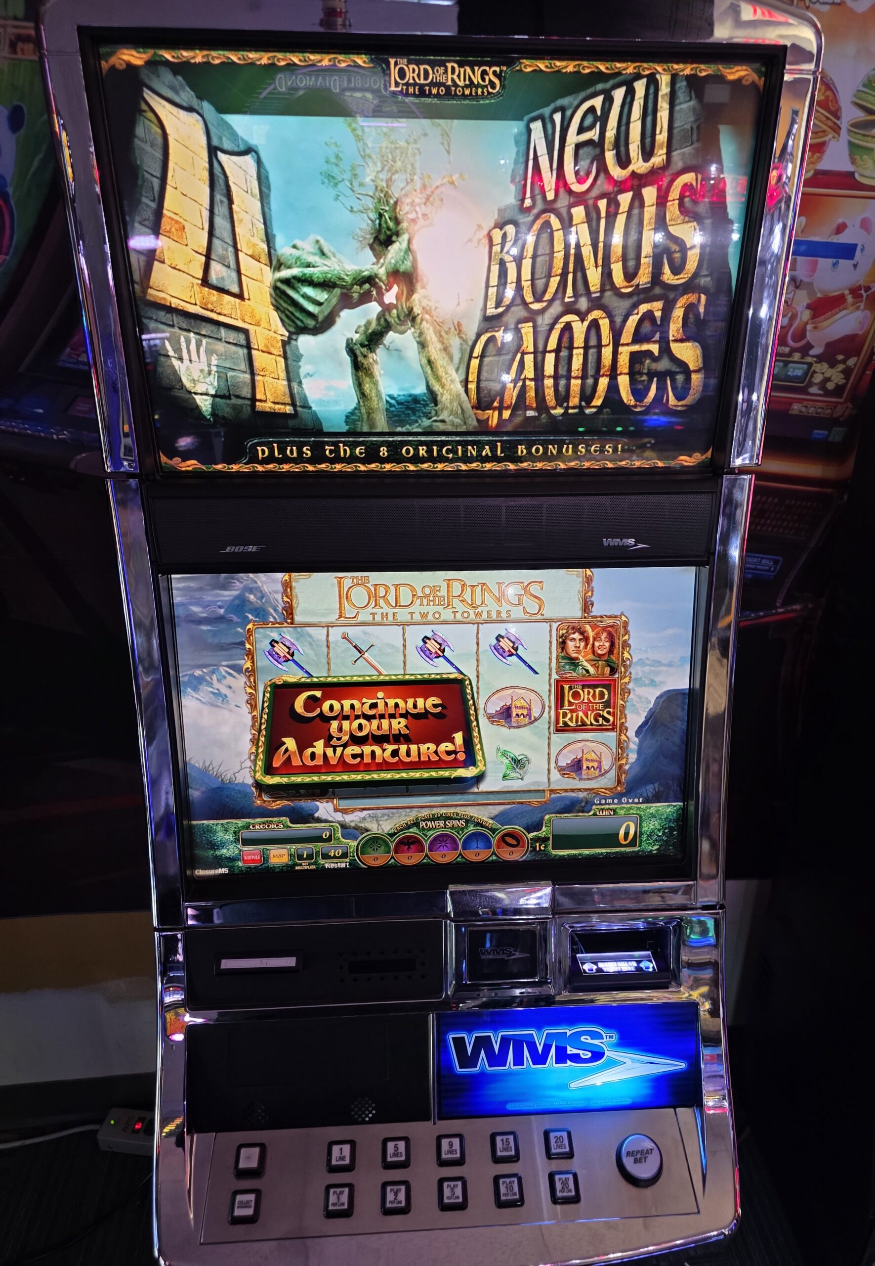With LED’s surrounding the top, an LED LIGHT bar across the top of the screen, super bright RGB LED back-lit reels, this game is sure to excite and light up any room. It teases often and goes into the bonus frequently.